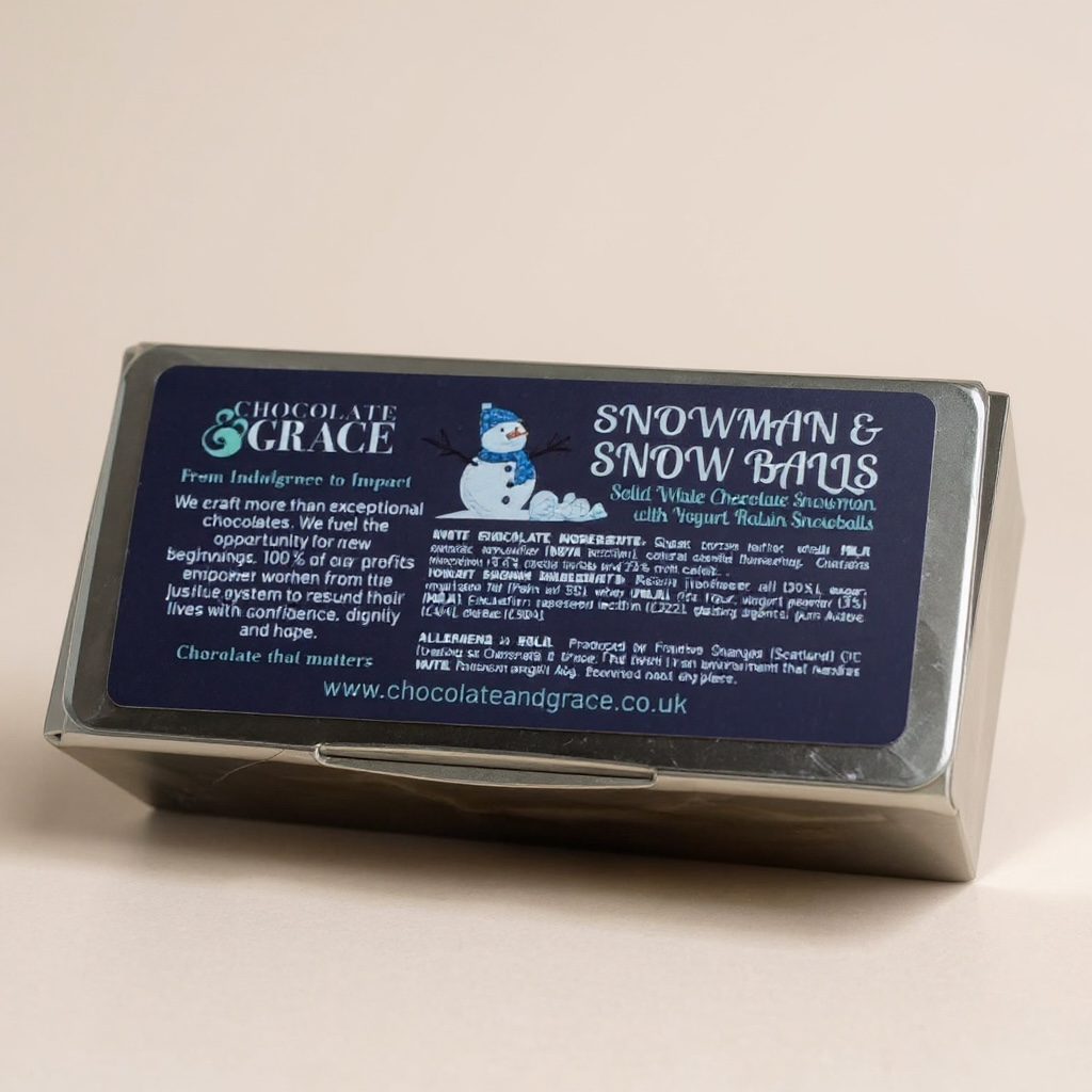 Snowman & Snow balls- Handcrafted from smooth, traceable Belgian chocolate, these charming snow people are a festive treat with a playful twist. Each figure comes with sweet yoghurt-coated raisin 'snowballs', adding a creamy bite that pairs perfectly with the rich white chocolate. A delightful seasonal gift for both children and adults, these snow people are as fun to share as they are to enjoy.